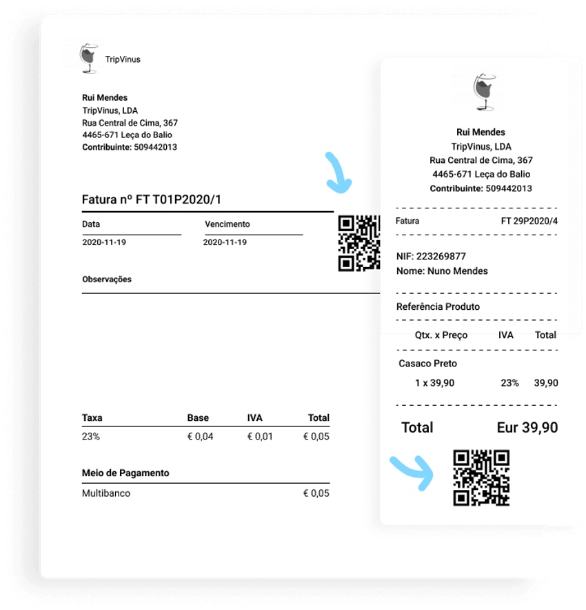 O cliente recebe uma fatura, com o mesmo aspeto e campos, e ainda com um QR Code.