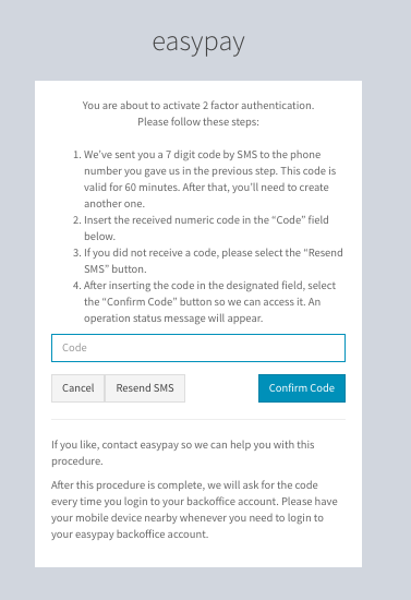 Al crear la cuenta de pagos easypay, tienes acceso al Backoffice. Para acceder al Backoffice, siempre tendrás que realizar una autenticación segura (SMS o aplicación). Este procedimiento es requerido por los estándares de la PSD2 (Directiva del Servicio de Pagos 2) y tiene la intención de garantizar que solo aquellos que tienen el fuerte factor de autenticación puedan acceder al Backoffice de easypay´. Este procedimiento elimina, entre otras cosas, las acciones de suplantación de identidad.