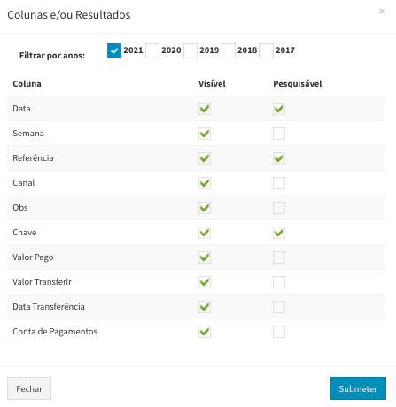 - Selecione os campos que quer visíveis na sua listagem e os campos onde quer pesquisar.